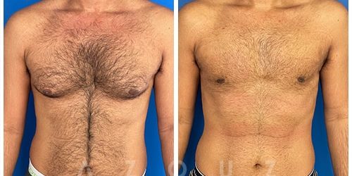 Description: This man was bothered by chest asymmetry, as his left breast was larger than his right. He had mild grade 1 gynecomastia of his right breast and grade 2 gynecomastia of his left breast. He underwent liposuction and the removal of both male breasts to achieve a symmetrical, flat chest. He was thrilled with the results and felt more comfortable with a masculine chest.