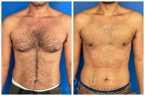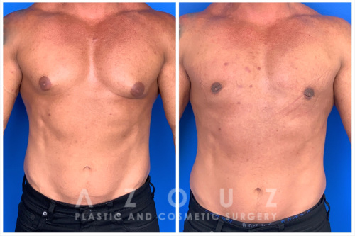 Description: This patient had gynecomastia and loose skin of his chest. Dr. Azouz removed the glandular tissue and tightened the skin, creating a smooth and flat chest, significantly improving the patient’s confidence and comfort.