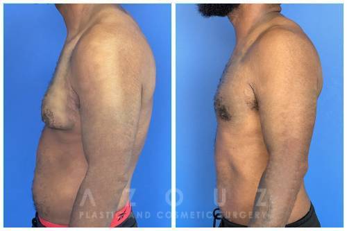 Description: This man was bothered by his chest asymmetry, as his left breast was larger than his right breast. He underwent gynecomastia surgery to remove the male breast tissue and liposuction of stubborn chest fat. Dr. Azouz used specialized techniques to improve skin laxity and reduce the need for additional skin removal surgery. He felt much more confident after his surgery.